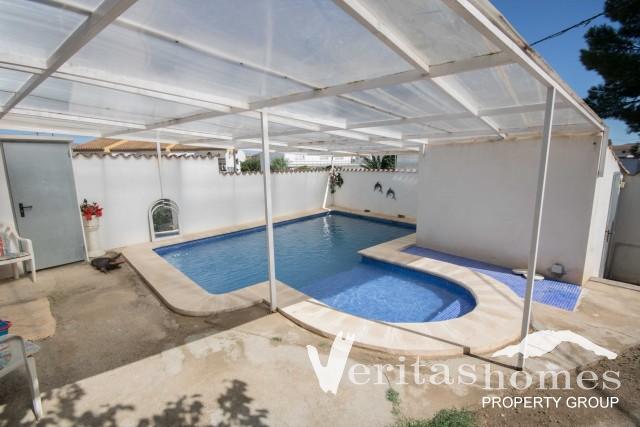 The property is set inside a fully walled plot that is shared with the neighbouring house and has ample garden area as well as a private swimming pool with a plexiglass roof. To access the house there is a large metal gate that is opened manually but could easily be made electric.