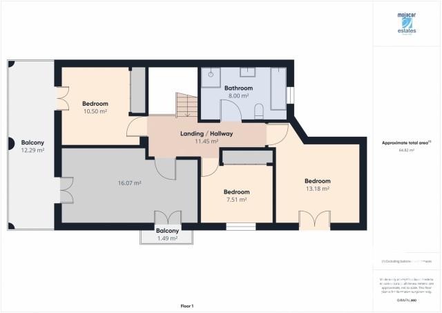 First floor: There are four bedrooms on this level, 2 with fitted wardrobes and 2 with free standing wardrobes. Two bedrooms have double doors leading out to a covered terrace with views of the countryside and the other two have access to balconies. There is a full bathroom on this level with bath and walk-in shower, bidet, and toilet.